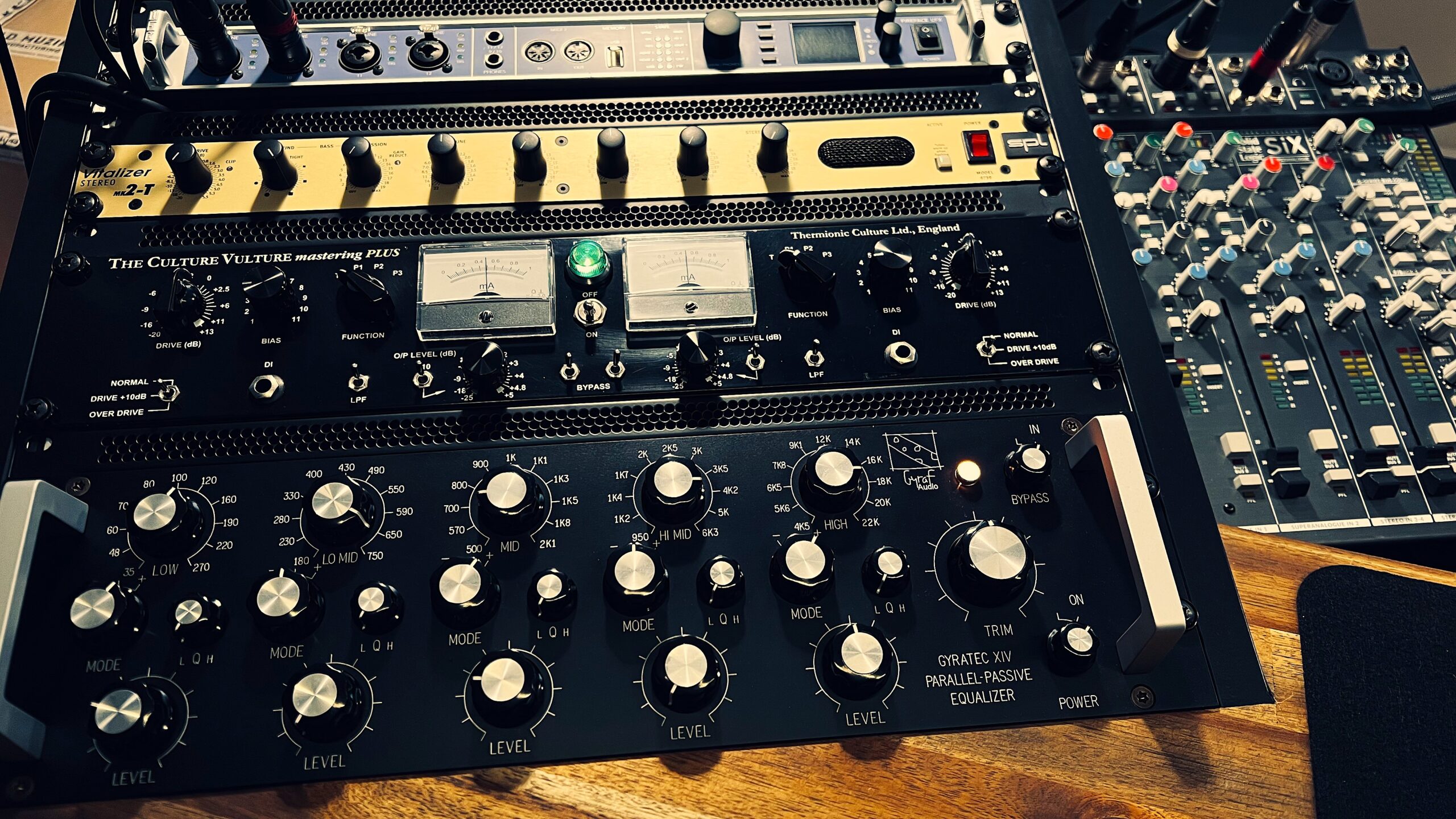 Das Studio verfügt über eine selektierte Auswahl an analoger Hardware. Mit High-End Mastering Geräten wie dem Elysia Alpha Compressor und dem Gyraf XIV Parallel Passive Equalizer kann Musik „Tiefe“ und „Leben“ eingehaucht werden.
